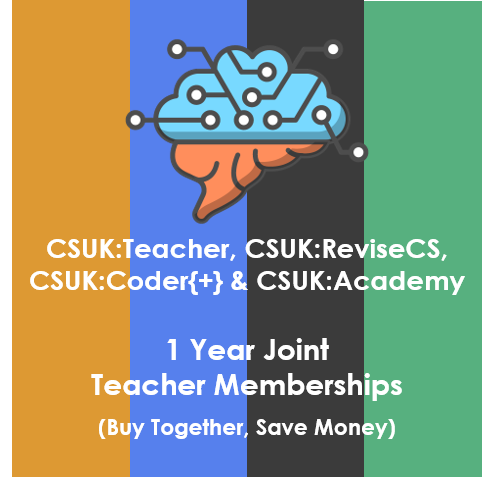 This product adds all CSUK memberships, either to your existing CSUK account (if renewal) or to a new teacher’s account, created at the checkout: CSUK:Teacher, CSUK:Academy, CSUK:ReviseCS and CSUK:Coder.